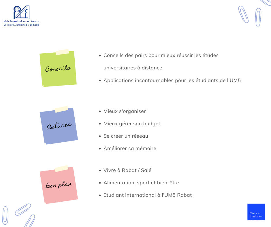 En cette rentrée spéciale 2020-2021, ne manquez pas la chance de partager avec vos paires, vos conseils et astuces pratiques sous forme d’articles (en arabe, en français ou en anglais) pour mieux réussir les études universitaires et la vie à l’UM5.
